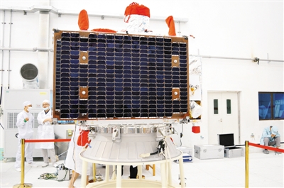 在812所进行磁测试的量子卫星(2014年12月2日摄)。新华社发(中科院微小卫星创新研究院供图)