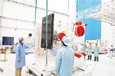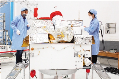 在酒泉卫星发射中心,量子科学实验卫星在安装外表面热控材料(2016年7月26日摄)。