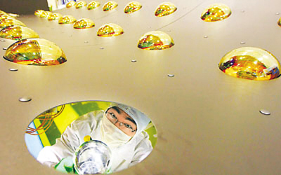 科研人员正在装配的“泡泡”为光电倍增管,当它探测到中微子后,可将其信号放大,从而能够进行准确的测量计算。