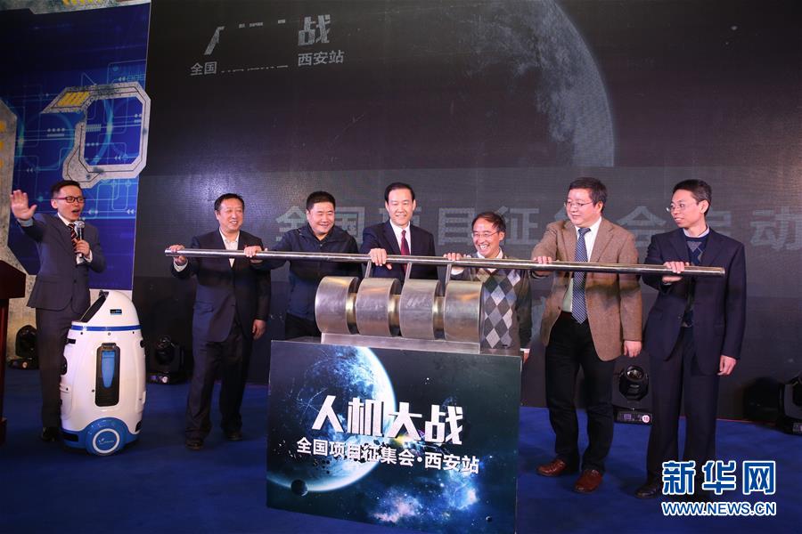 11月5日,在《人机大战》全国项目征集会西安站现场,与会嘉宾启动项目征集会。当日,由中央电视台综合频道、中国科学院科学传播局联合主办的大型科学挑战类节目《人机大战》在西安举行首场项目征集会。《人机大战》是中科院和央视联手搭建的中国科普擂台,将邀请顶尖人工智能向人类发起挑战,是国内首档聚焦人工智能的科学挑战节目。(新华社记者金立旺摄)