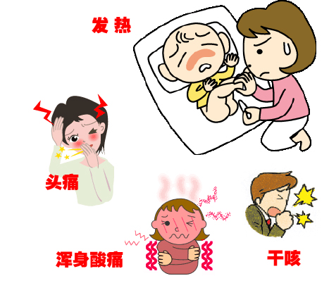 症状主要表现为:持续高烧(高于38℃),头痛和全身酸痛、乏力,干咳、少痰,部分病人有气促等呼吸困难症状,少数进展为呼吸窘迫综合征,肺部影像学显示肺炎改变。一般感冒病征包括发烧,咳嗽,头痛,可在数日后转好,并且一般没有肺炎迹象外周血白细胞计数无明显变化,淋巴细胞计数减少。抗菌药无效。SARS病毒能侵犯多种脏器,引起免疫系统对脏器的过度攻击,导致严重的脏器损伤。
