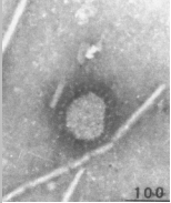 人工感染传染性胃肠炎病毒的仔猪回肠上皮细胞照片,病毒内部有一个“烧面圈”样的核壳体,外面是病毒囊膜