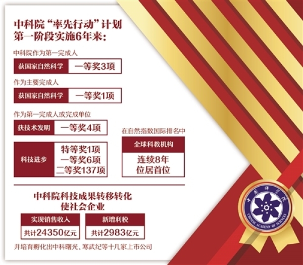 这只是个缩影。据介绍,6年来,中科院作为第一完成人,获国家自然科学一等奖3项;作为主要完成人,获国家自然科学一等奖1项;作为第一完成人或完成单位,获技术发明一等奖4项,科技进步特等奖1项、一等奖6项,共获二等奖137项。在自然指数国际排名中,连续8年位居全球科教机构首位。在由中国科学院、中国工程院院士评选的年度中国十大科技进展中,中科院作为第一完成人或完成单位一共有32项,占比达53%。