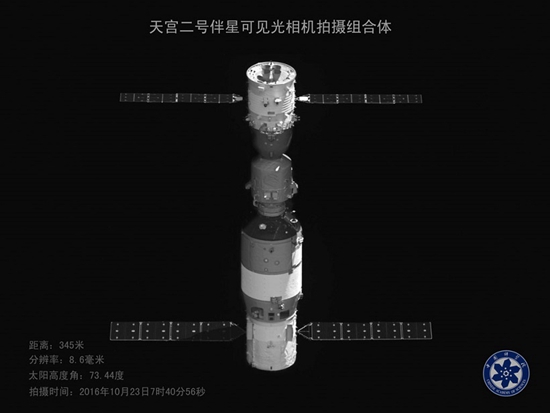 9月15日,伴随卫星随天宫二号空间实验室发射入轨,经过约40天在轨贮存,于10月23日7时31分从天宫二号上成功释放,并利用其携带的可见光相机和红外相机,对“天神”组合体进行拍摄,近日成功回传地面。