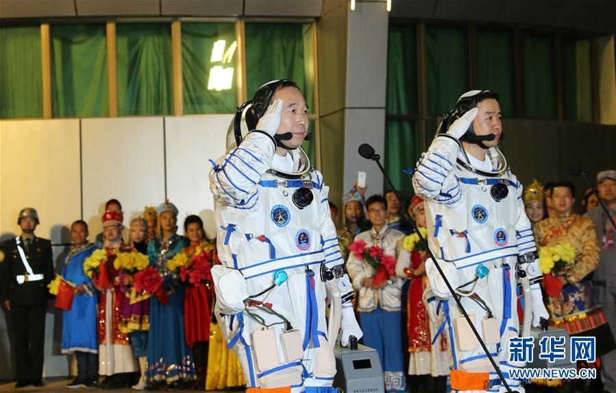 航天员景海鹏(左)、陈冬在出征仪式上敬礼