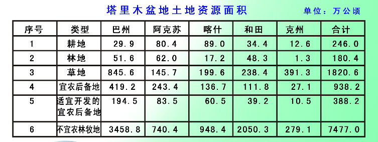 气候温暖,厥土良沃,使塔里木河流域具备得天独厚的条件,自古即以“城国”-以农为主区别于准噶尔盆地以牧为主的“行国”。片片绿洲成为荒漠地区亮丽的风景,成为一处处塞外江南。五地州耕地面积为246万公顷、草地1820万公顷、林地180万公顷。此外,有宜农后备土地资源938万公顷,其中适宜开发的有388万公顷。