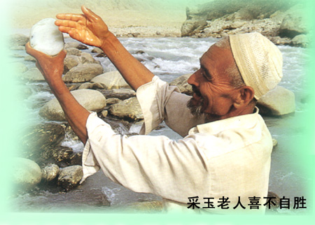 塔里木河流域矿产十分丰富,图为采玉老人刚刚从河水中采到一块羊脂白玉时喜不自胜的情景。(见科普专题:塔河千秋栏目)