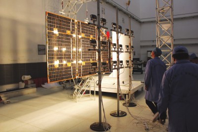 12月1日,在酒泉卫星发射中心,科研人员在试验帆板光照。新华社发
