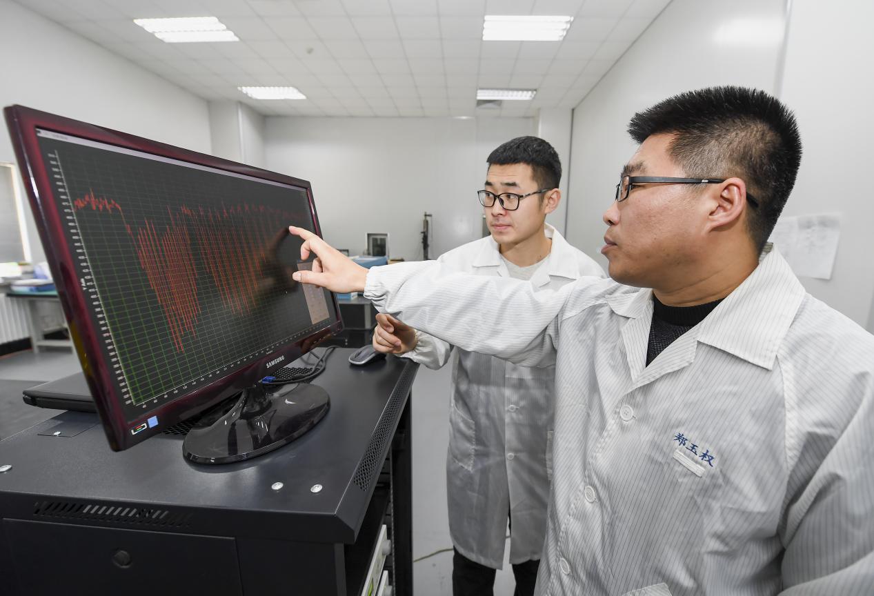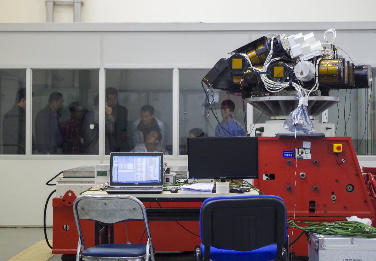 面对困难与压力,年轻的小伙子们迎难而上,先后突破了高可靠性双面指向镜制造、高精度定标等关键技术,一步一步坚实地朝着最终目标迈进。图中助理研究员王龙正在对指向镜组件进行面型精度测试。