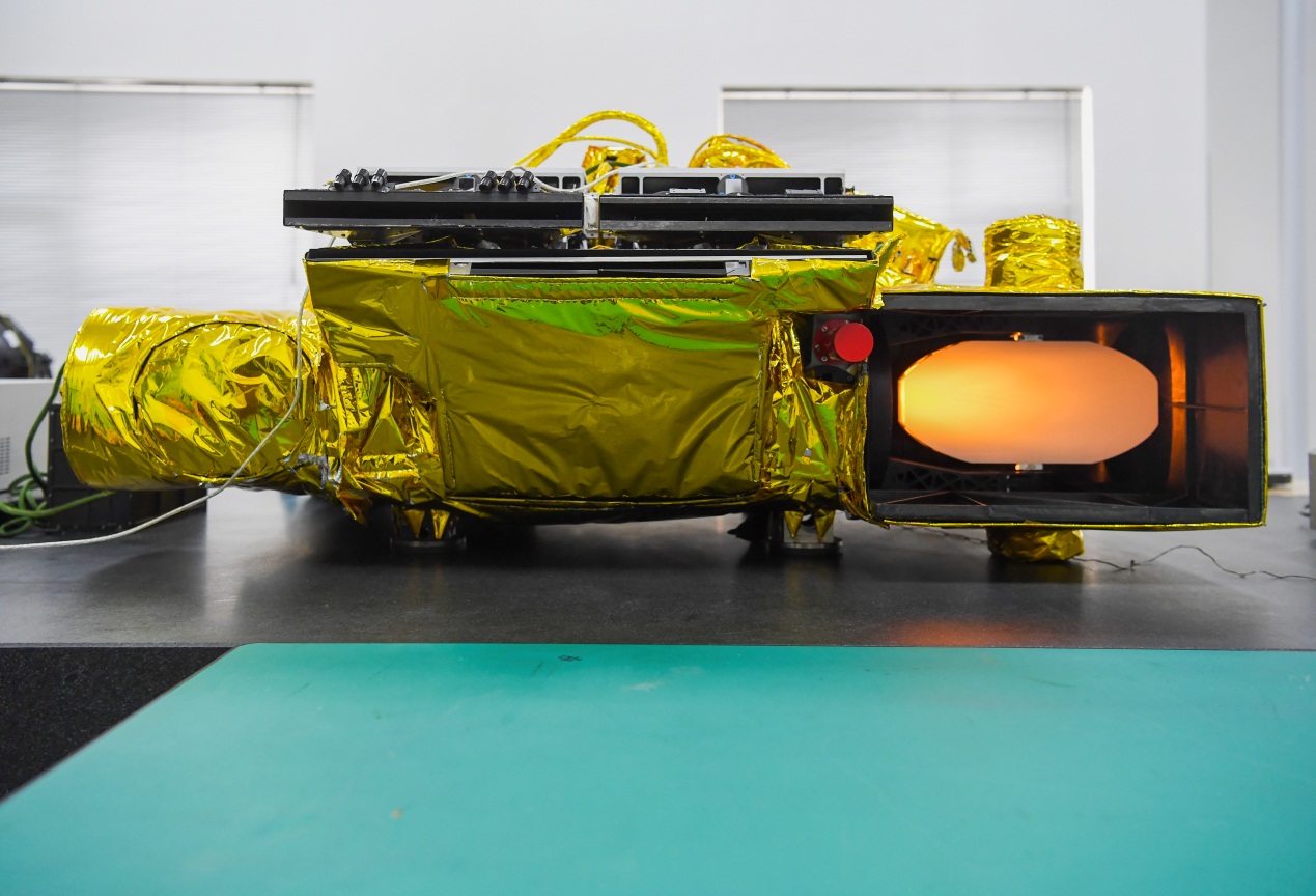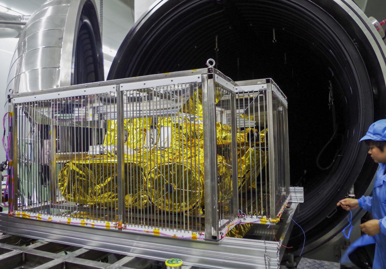 探测仪想要“上天”执行任务,必须经过各种严苛的试验考验,热真空试验便是其中之一。仪器被罩进“加热笼”后送进真空罐内测试,这就好比是将仪器放置于冷黑的太空中,同时接受着太阳的炙烤,只有在这样的严酷条件下仍能正常工作,才算通过试验。