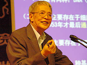 由于是科普报告,冼鼎昌院士特别用简洁、生动的语言将一个个专业术语阐述得十分清晰明了,巧妙地将氨基酸链比喻成宝石项链、将DNA脱氧核糖核酸比作建筑物的砖木、把DNA双螺旋结构比作一个扭成麻花状的梯子……,使听众一次次地进入梦幻般的科学世界。