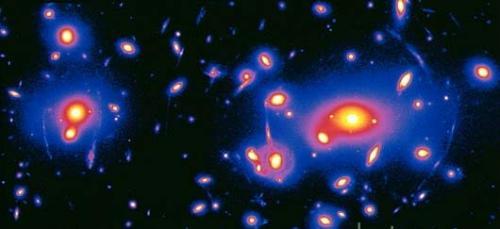 重力透镜现象。图为星系群Abell 2218形成的重力弧五彩可见光照片。这张照片是被哈勃望远镜所拍摄到的。重力弧的研究为星系早期进化提供了一个最为直观的景象。
