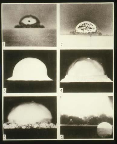 世界上第一颗原子弹爆炸的景象。拍摄于1945年7月16日下午5点30分。爆炸地点位于美国新墨西哥的阿拉莫戈多空军基地附近的沙漠中,爆炸产生的强光使夜晚的天空比正午还要明亮许多倍,200公里之外的玻璃窗也被震得粉碎。升起的蘑菇云高达15到20公里。三个星期之后,第二颗原子弹于日本广岛被引爆。