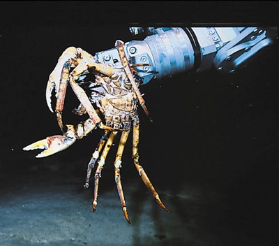一只躲藏在海底岩石内的螃蟹被水下缆控潜水器“机器手”捕获