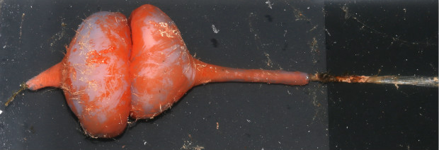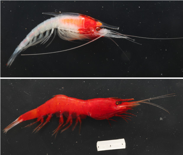 两种深海虾。在没有阳光照射的深海,红色的虾比较常见,而一半红一半白的虾十分罕见。