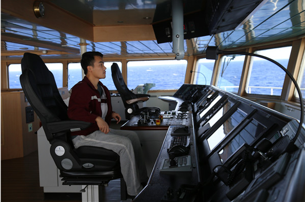 在青岛离岸时,记者发现船是“横向”移出港口,而不是向前方开动。隋以勇说:“这艘船的动力系统采用电力推进系统,可以实现原地360度回转,灵活性很强。我开船就像玩游戏机一样简单,想向前走就向前走,斜着走就斜着走,想不动就不动。”