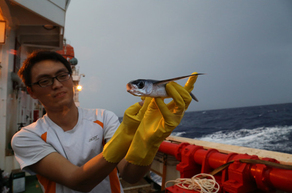 天刚亮,科考队员在甲板上发现一只夜间跳上甲板的飞鱼。 赵琬微 摄 (新华社/中国特稿社)