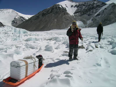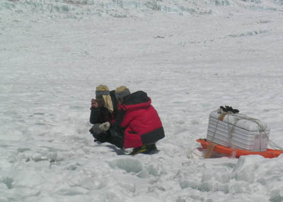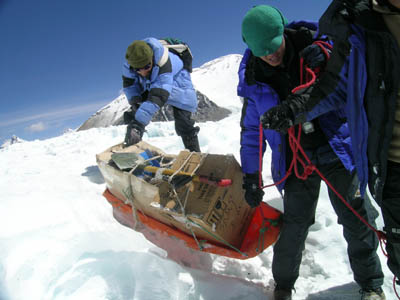 科考队员用人拉雪橇的方法往垭口运送仪器