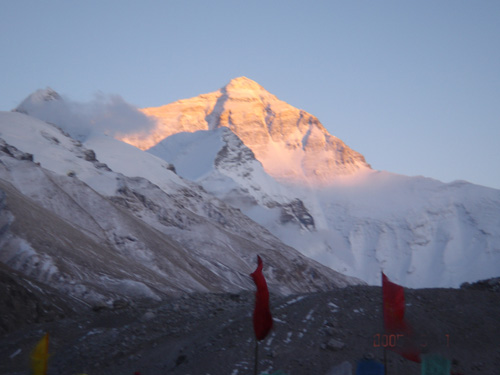 金色的珠峰,看那山巅还有一抹旗云。科学家能够根据旗云的方向和姿态判断天气的状况。