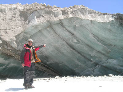 中绒布冰川末端的一个冰层剖面(能看到冰层的沉积情况)。