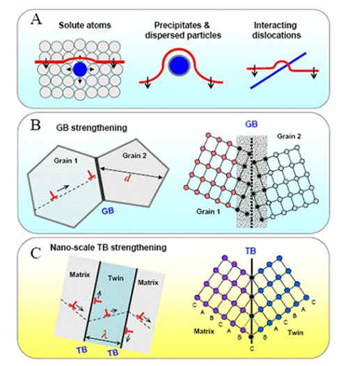 A和B分别是材料的传统强化途径示意图。A(自左向右):固溶强化、第二相弥散或沉淀强化、加工(或应变)强化。B:晶粒细化强化(或晶界强化)。C为新提出的纳米尺度孪晶界强化示意图,右侧为一孪晶界示意图。