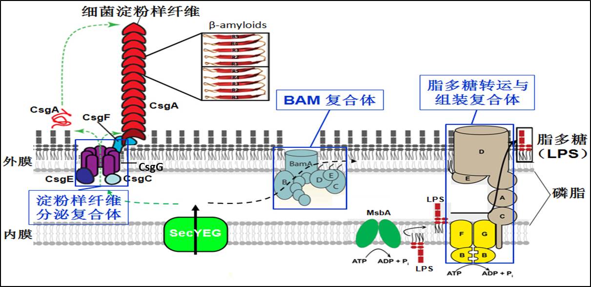 了细菌脂多糖分子跨外膜转运与组装机理,阐明了革兰氏阴性细菌表面淀粉样纤维的生成机理,初步揭示新生