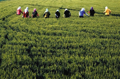 “渤海粮仓”项目需要大量的优质小麦麦种,在山东省无棣县一个小麦育种田内,工作人员一字排开,手工剔除杂草。