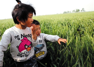 河北海兴县示范区,两个小朋友已经认不出自家的田地,原来这片田种棉花和玉米,这是第一次种小麦,预计亩产能超过700斤。
