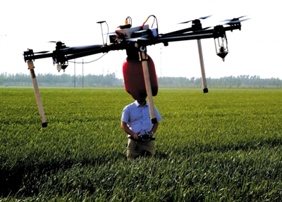 河北省南皮县示范区,科研人员用遥控飞机喷洒药物防治病虫害,每亩成本仅20元,受到农民的欢迎。