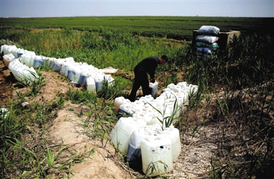 山东无棣寇义祥在自己的麦田里整理改良土壤用的药剂,他在中科院的技术支持下,成功改良麦田。