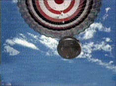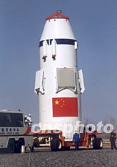 1月5日晚七时许,“神舟”四号飞船在太空翱翔七天后在内蒙古中部草原成功着陆,顺利回收。图为电脑模拟的“神舟”四号回收舱返回图。