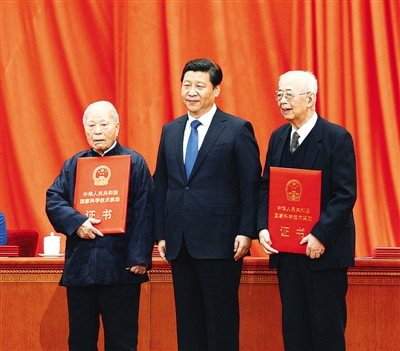 习近平与国家最高科学技术奖获得者张存浩(右)和程开甲合影