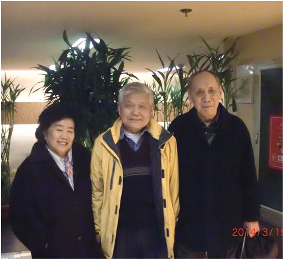 1940年在重庆沙坪坝进入中央大学附属小学一年级的金作怡、郝柏林和毛士艺2014年3月在北京聚会时合影, 他们的父亲分别是中大农学系教授金善宝、森林系教授郝景盛、园艺系教授毛宗良