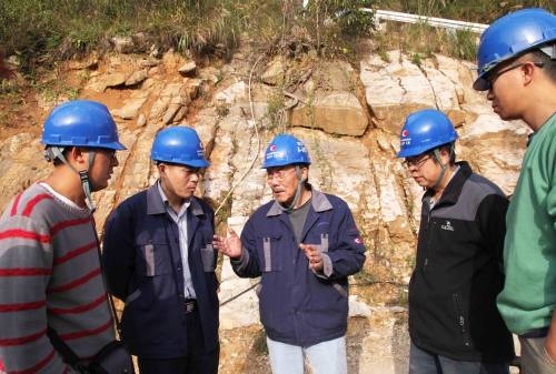 2014年大窝凼施工现场,南仁东与工程技术人员讨论