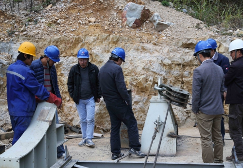 2014年大窝凼施工现场,南仁东与工程技术人员检查1h托运装置的工装