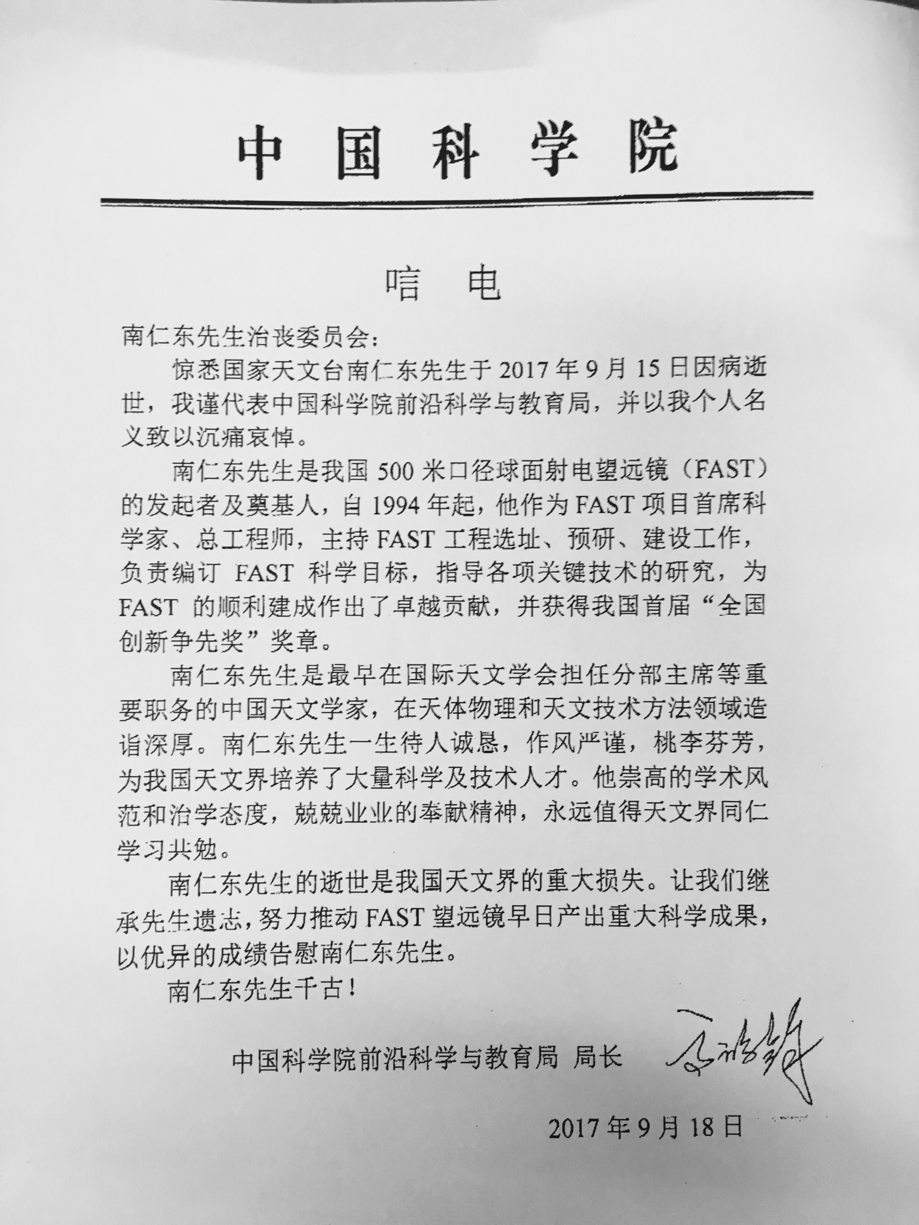 中国科学院党组副书记、副院长刘伟平,中国科学院副院长王恩哥、中国科学院秘书长邓麦村、中国科学院副秘书长何岩对南仁东先生的逝世表示深切哀悼,对家属表示慰问。