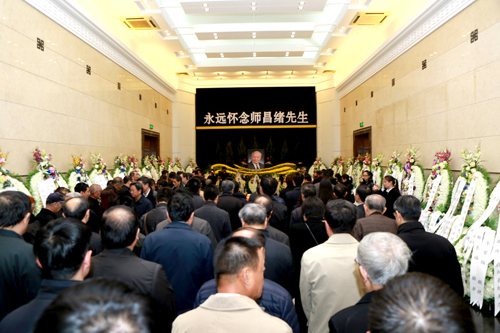 上午9时,伴随着悲伤的乐曲,原中共中央政治局常委李长春,全国政协副主席、九三学社中央主席韩启德,原全国人大常委会副委员长路甬祥,中国工程院主席团名誉主席徐匡迪等缓步来到师昌绪同志的遗体前肃立默哀,向师昌绪先生的遗体三鞠躬,并与家属一一握手。中国科学院院长、党组书记白春礼,副院长、党组成员李静海、阴和俊,党组副书记方新,副秘书长曹效业,师昌绪先生的亲友、同事、学生及社会各界人士参加了告别仪式。大家手中拿着师昌绪先生的生平纪念册,胸前佩戴白花,表情肃穆,慢慢步入灵堂,送敬爱的师昌绪先生最后一程。