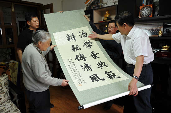 哈尔滨理工大学校长李大勇代表全校师生向王大珩先生赠送题字