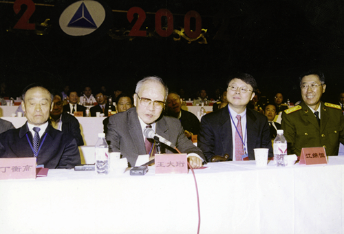 2002年9月16日在长春光机所建所50周年庆祝大会上讲话(左起:丁衡高、王大珩、江绵恒、胡世祥)