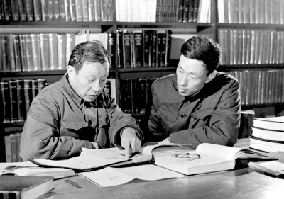 王大珩(左)与他的学生中国科学院长春光学精密机械研究所副研究员蒋筑英在研究工作(资料照片)。新华社发