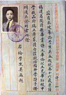 吴孟超学生时代的面会证明书