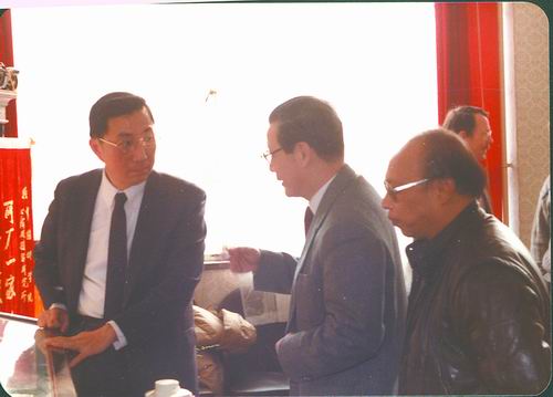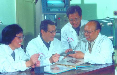 1985年,严东生和茅志琼、谢瑞宝、郭景坤讨论复合材料研究工作。