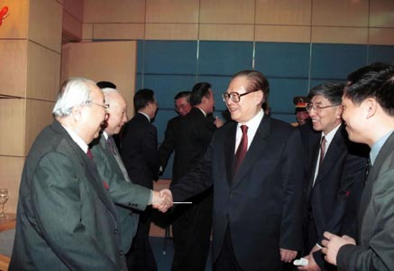 2001年4月29日,钱伟长参加清华大学90周年校庆典礼。图为中共中央总书记、国家主席江泽民会见出席庆祝大会的费孝通(左一)、钱伟长(左二)。