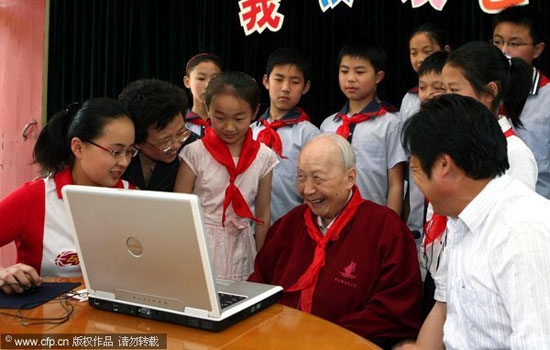 2007年5月14日,95岁高龄的著名科学家、教育家钱伟长来到无锡市荡口中心小学,受到师生们的热烈欢迎,这是他第12次回到母校。