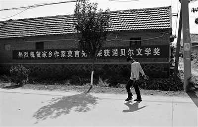 10月14日,莫言出生的地方平安村,到处张贴着横幅。