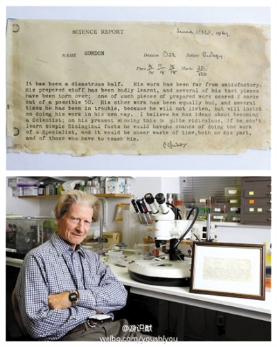 在格登剑桥大学的办公室里,至今仍挂着60多年前的那份“差生报告”。“当遇到麻烦,比如实验不成功,我就看看这个报告,提醒自己也许不擅长这个工作。但我要努力,否则真的被老师说中了。”格登说。