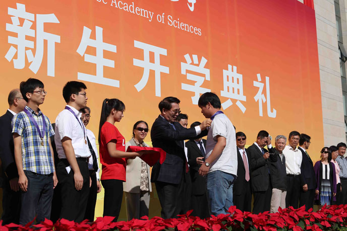 9月12日,中科院院长、国科大名誉校长白春礼在国科大2015级新生开学典礼上为荣获校级荣誉称号的学生代表颁发奖章