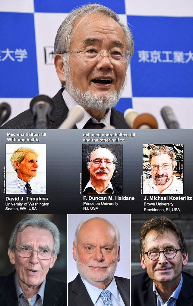 2016诺奖得主:大隅良典(上,生理学或医学奖);(中,物理学奖,从左往右)戴维·索利斯、邓肯·霍尔丹和迈克尔·科斯特利茨;(下,化学奖)让-皮埃尔·索瓦日、弗雷泽·斯托达特、伯纳德·费林加。(图片来源:新华/法新)