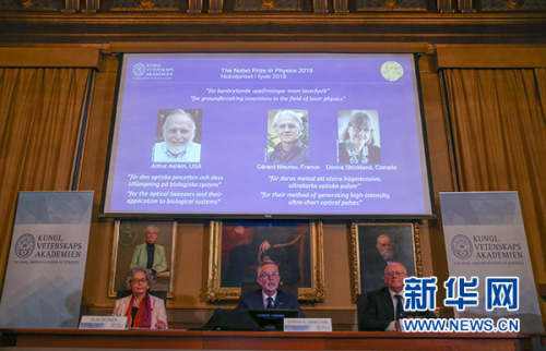 瑞典皇家科学院2日宣布,将2018年诺贝尔物理学奖授予美国科学家阿瑟·阿什金、法国科学家热拉尔·穆鲁以及加拿大科学家唐娜·斯特里克兰,以表彰他们在激光物理学领域的突破性贡献。