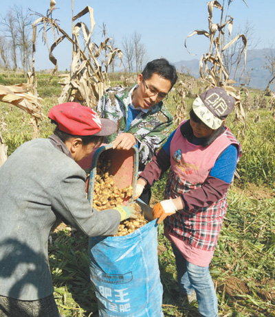 田通(中)与院坝村村民一起收获小黄姜。中科院供图